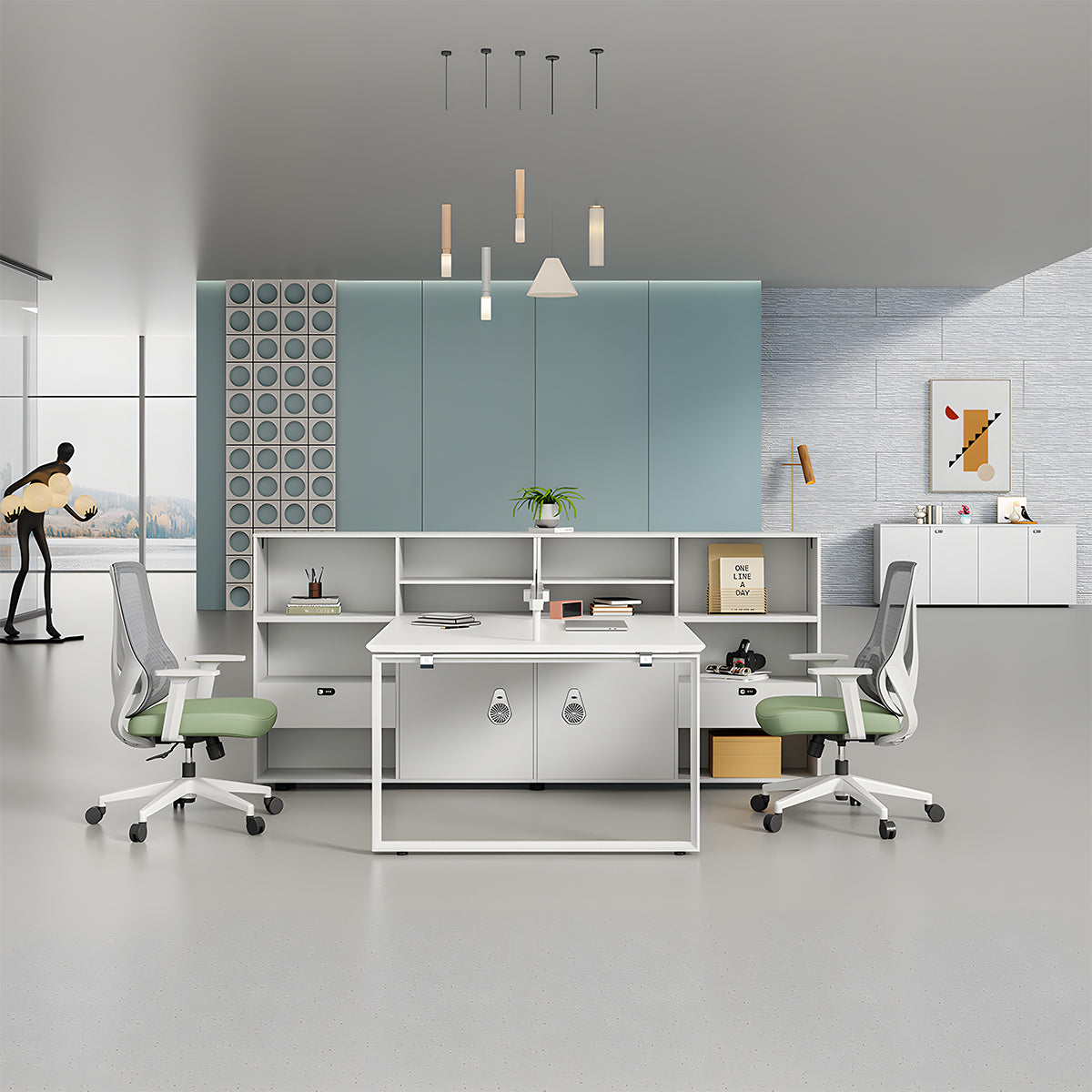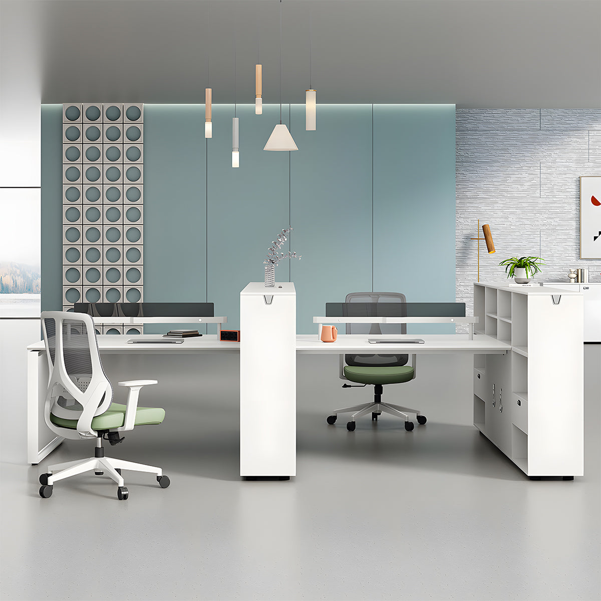 選ばれたデスクは、温かみのある木目調の天板が特徴で、L字型のデザインが空間を効率よく活用すると同時に、スタイリッシュな印象をも漂わせています。サイドキャビネットは必書類やオフィス用品を整理整頓するのに役立ち、幕板がプライバシーを保ちつつ、オフィスをより一層洗練させます。