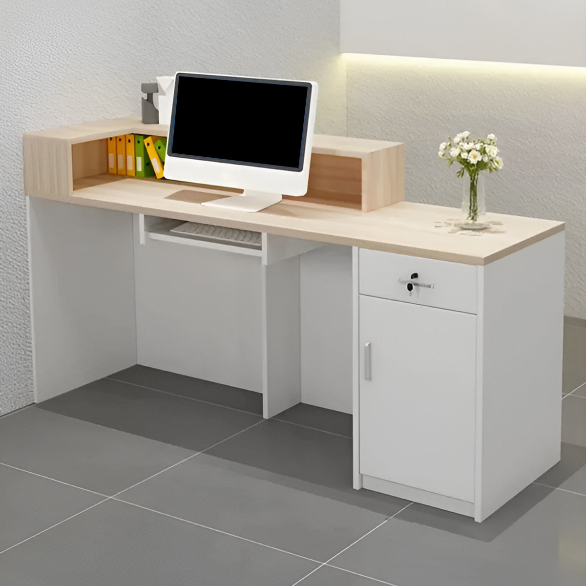 エコ板材 安全で無臭 頑丈 錠付き引き出し 上部天板 キーボードトレイ 仕切り板 バイカラー カウンター 受付カウンター シンプル モダン 洗練 ホワイト カスタマイズ可能 JDT-K-111