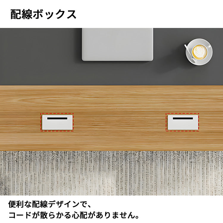 また、配線ボックスが付属しており、デスク周りのケーブル類をスッキリと整理できるため、作業効率が格段にアップします。デスクの脚部はスチール製のスラント脚を採用しており、シャープな印象を加えています。
