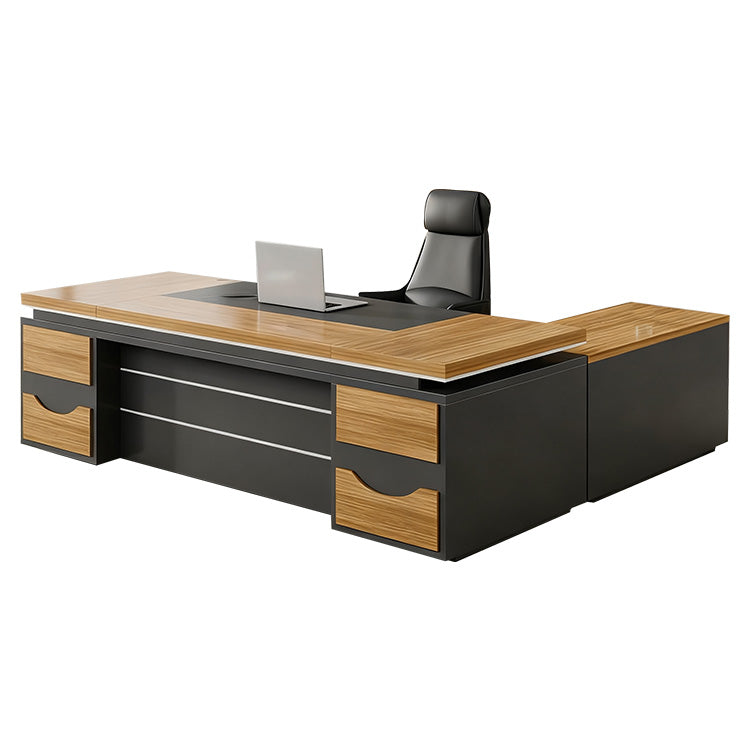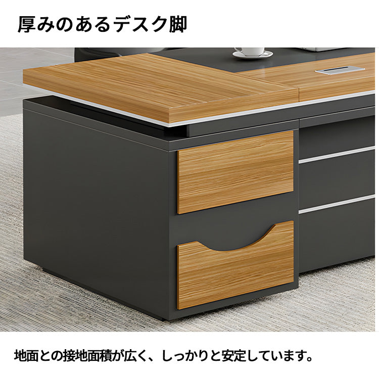選ばれたデスクは、温かみのある木目調の天板が特徴で、L字型のデザインが空間を効率よく活用すると同時に、スタイリッシュな印象をも漂わせています。サイドキャビネットは必書類やオフィス用品を整理整頓するのに役立ち、幕板がプライバシーを保ちつつ、オフィスをより一層洗練させます。