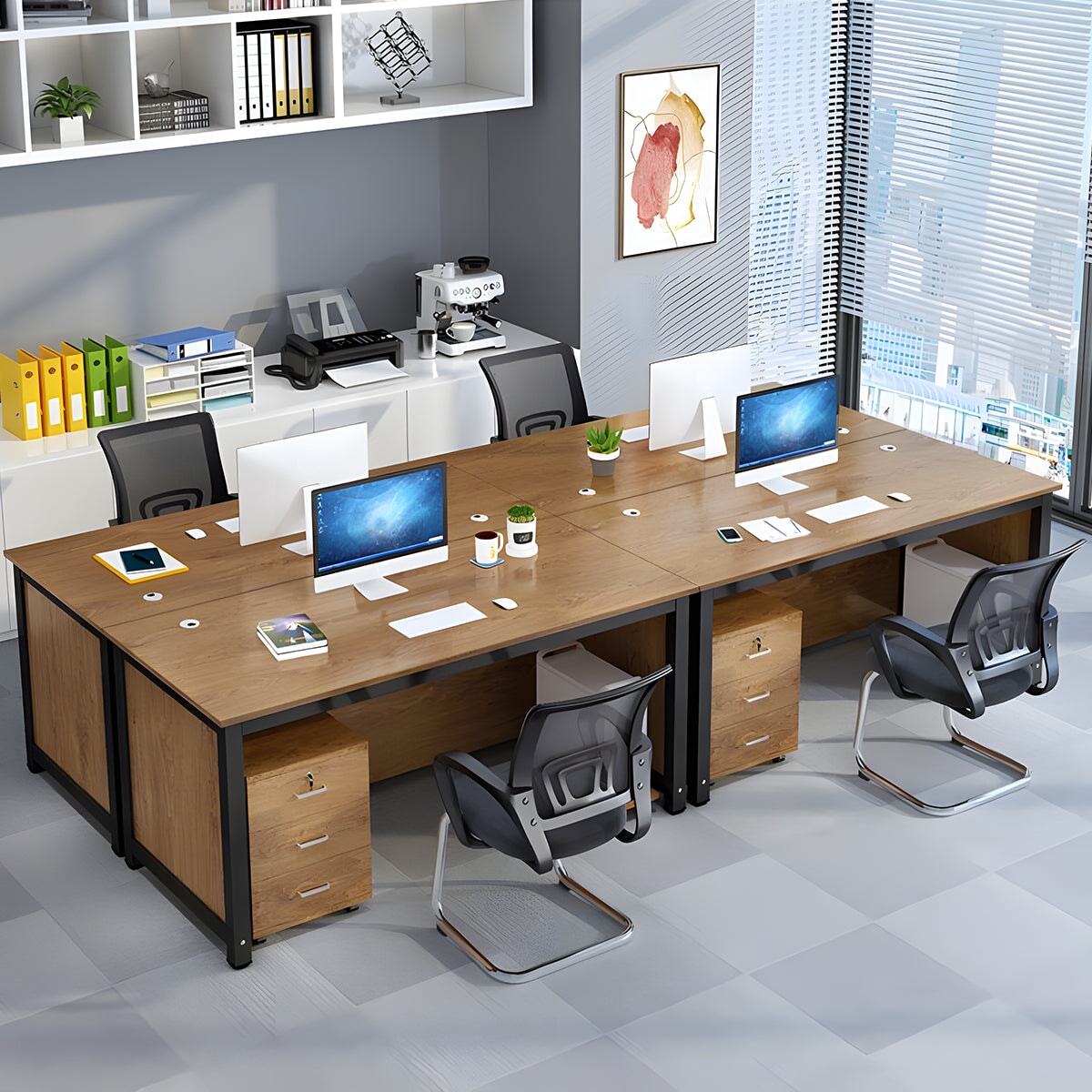 選ばれたデスクは、温かみのある木目調の天板が特徴で、L字型のデザインが空間を効率よく活用すると同時に、スタイリッシュな印象をも漂わせています。サイドキャビネットは必書類やオフィス用品を整理整頓するのに役立ち、幕板がプライバシーを保ちつつ、オフィスをより一層洗練させます。