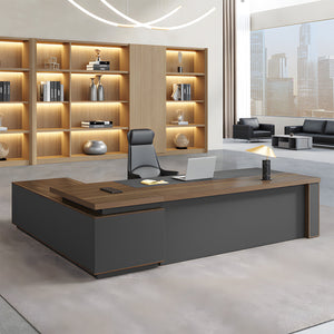 選ばれたデスクは、温かみのある木目調の天板が特徴で、L字型のデザインが空間を効率よく活用すると同時に、スタイリッシュな印象をも漂わせています。サイドキャビネットは必書類やオフィス用品を整理整頓するのに役立ち、幕板がプライバシーを保ちつつ、オフィスをより一層洗練させます。