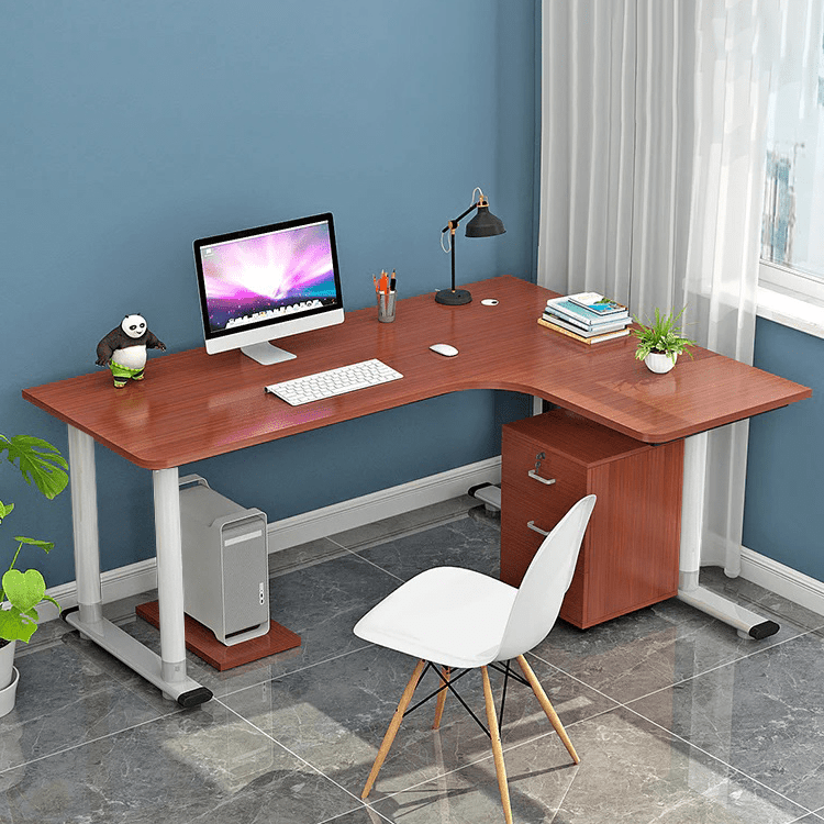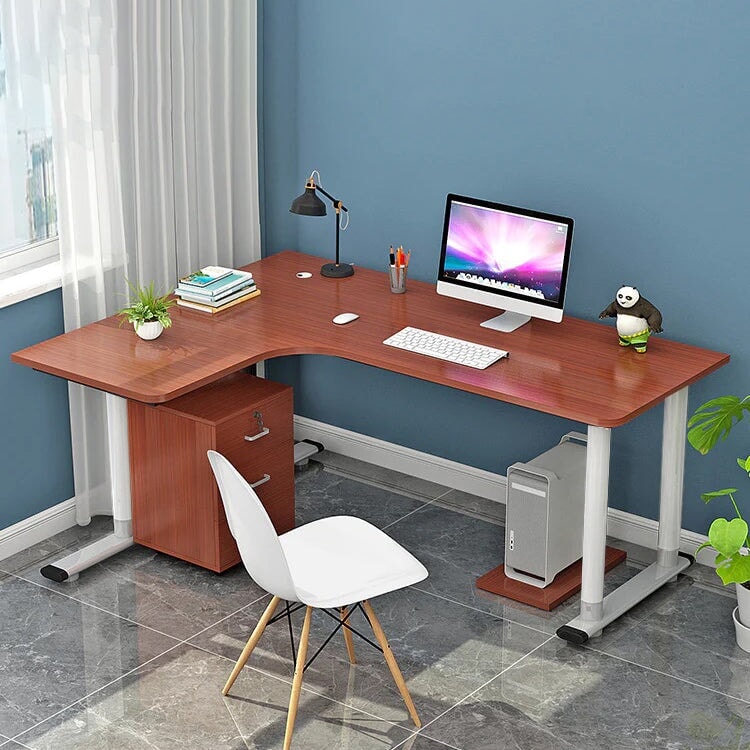 選ばれたデスクは、温かみのある木目調の天板が特徴で、L字型のデザインが空間を効率よく活用すると同時に、スタイリッシュな印象をも漂わせています。サイドキャビネットは必書類やオフィス用品を整理整頓するのに役立ち、幕板がプライバシーを保ちつつ、オフィスをより一層洗練させます。