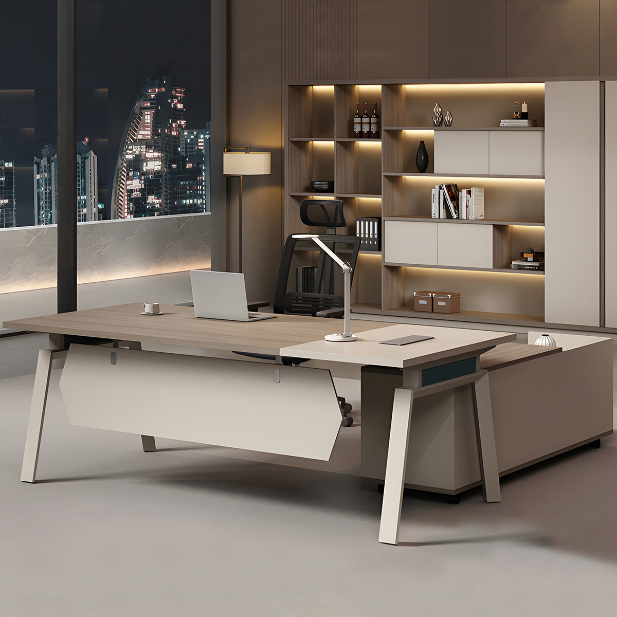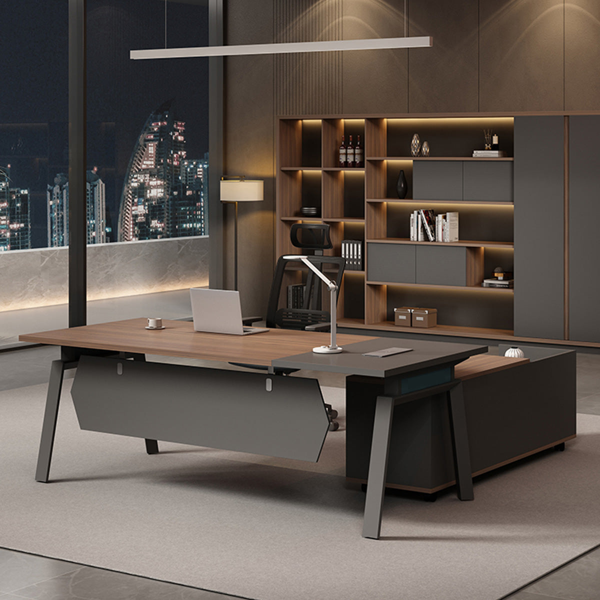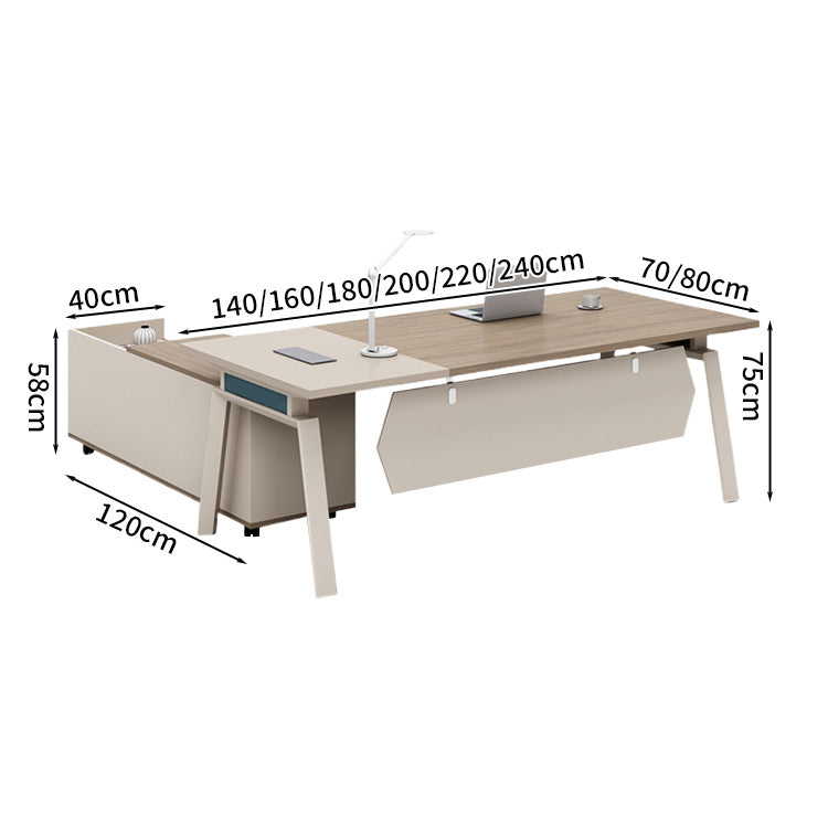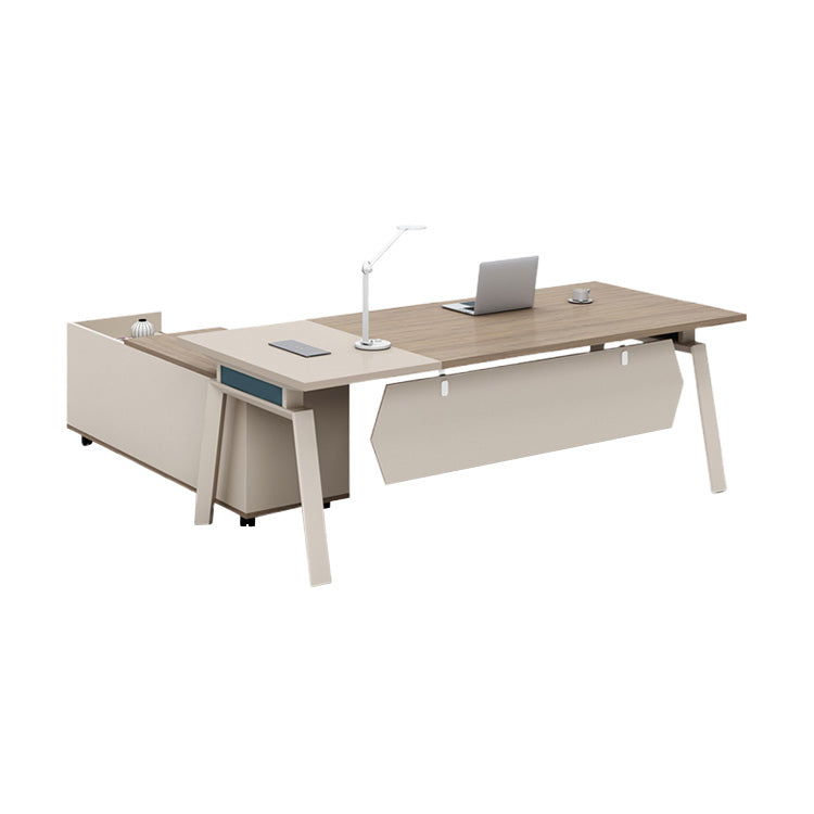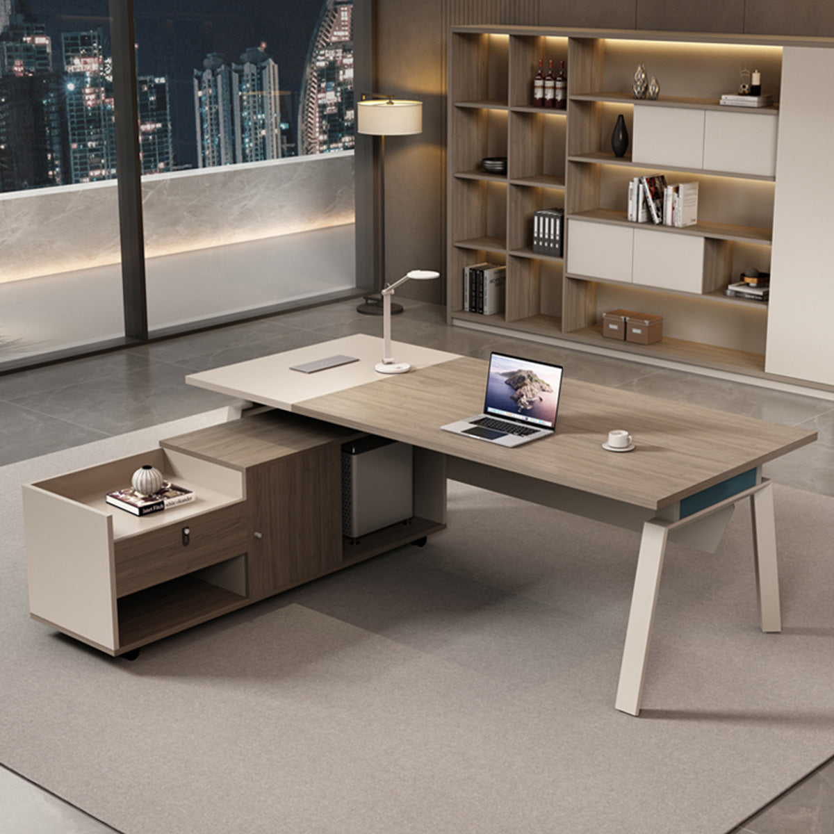選ばれたデスクは、温かみのある木目調の天板が特徴で、L字型のデザインが空間を効率よく活用すると同時に、スタイリッシュな印象をも漂わせています。サイドキャビネットは必書類やオフィス用品を整理整頓するのに役立ち、幕板がプライバシーを保ちつつ、オフィスをより一層洗練させます。