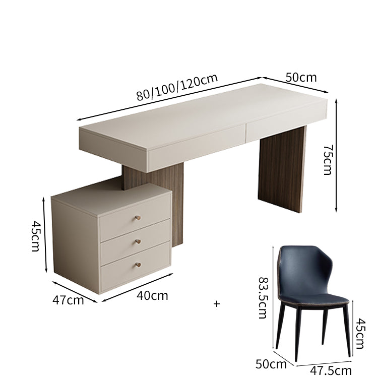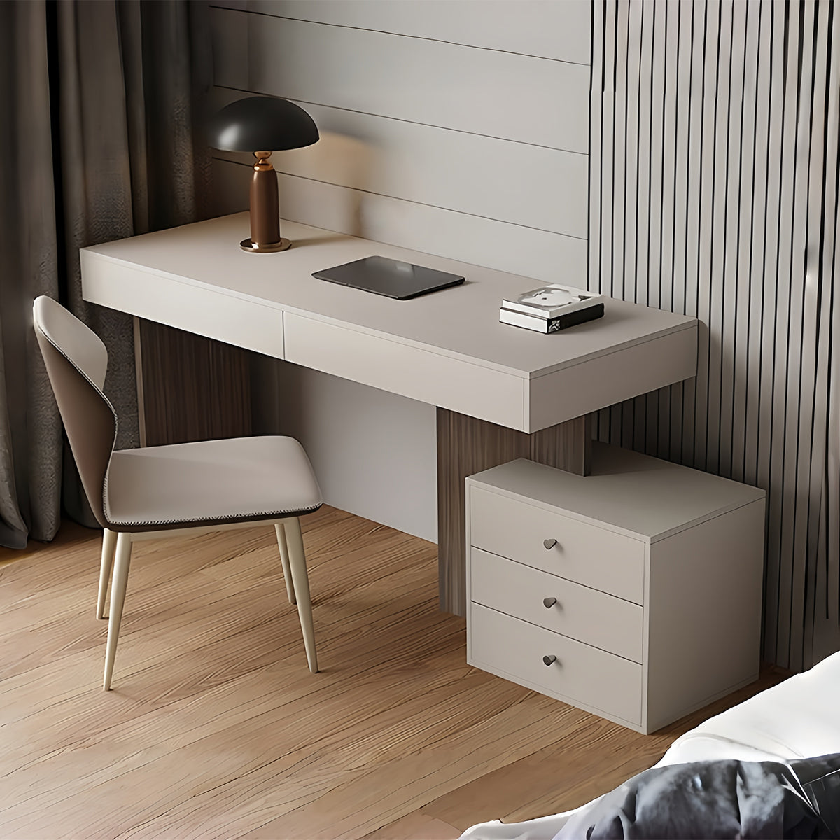 選ばれたデスクは、温かみのある木目調の天板が特徴で、L字型のデザインが空間を効率よく活用すると同時に、スタイリッシュな印象をも漂わせています。サイドキャビネットは必書類やオフィス用品を整理整頓するのに役立ち、幕板がプライバシーを保ちつつ、オフィスをより一層洗練させます。