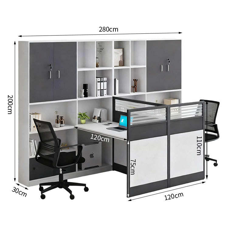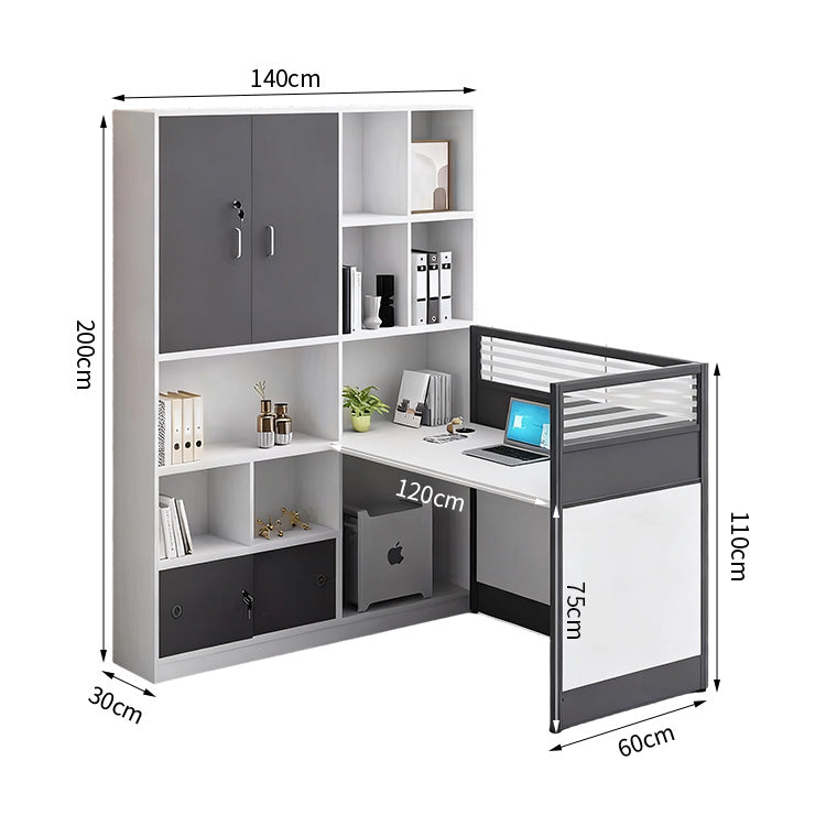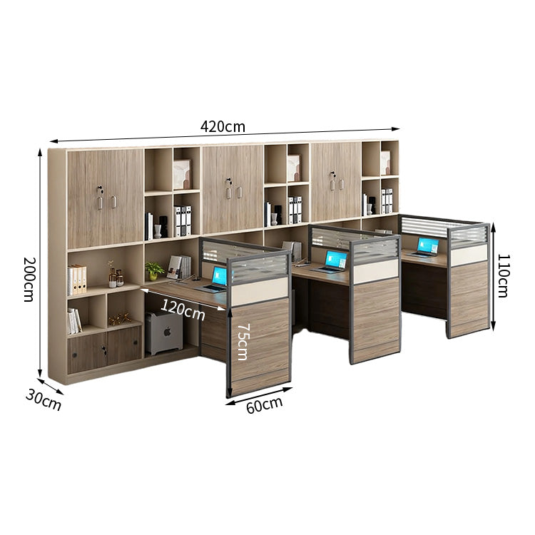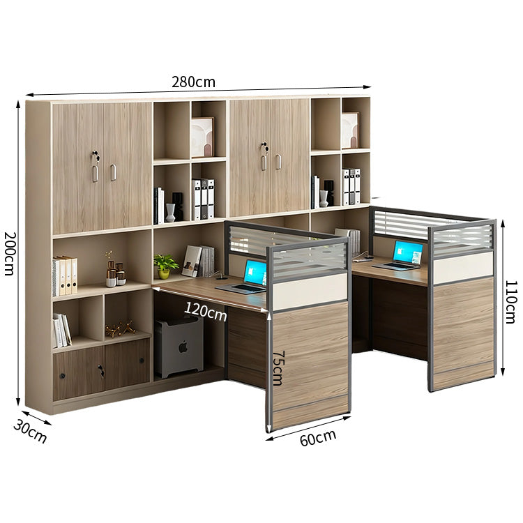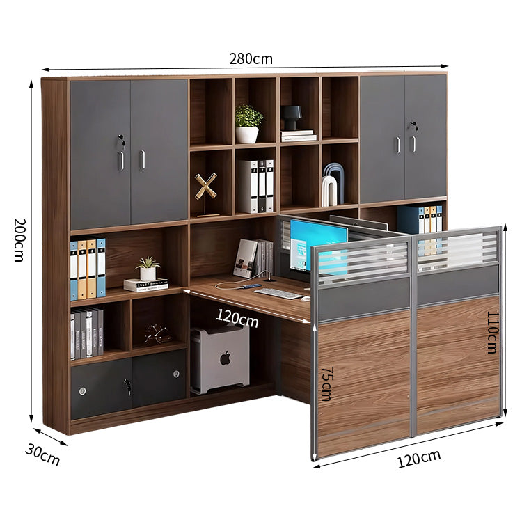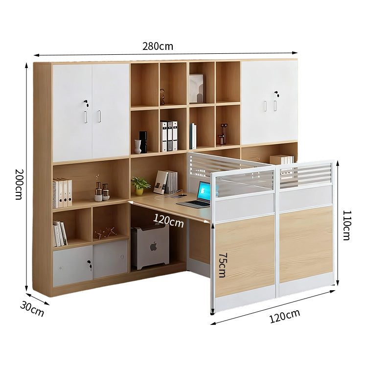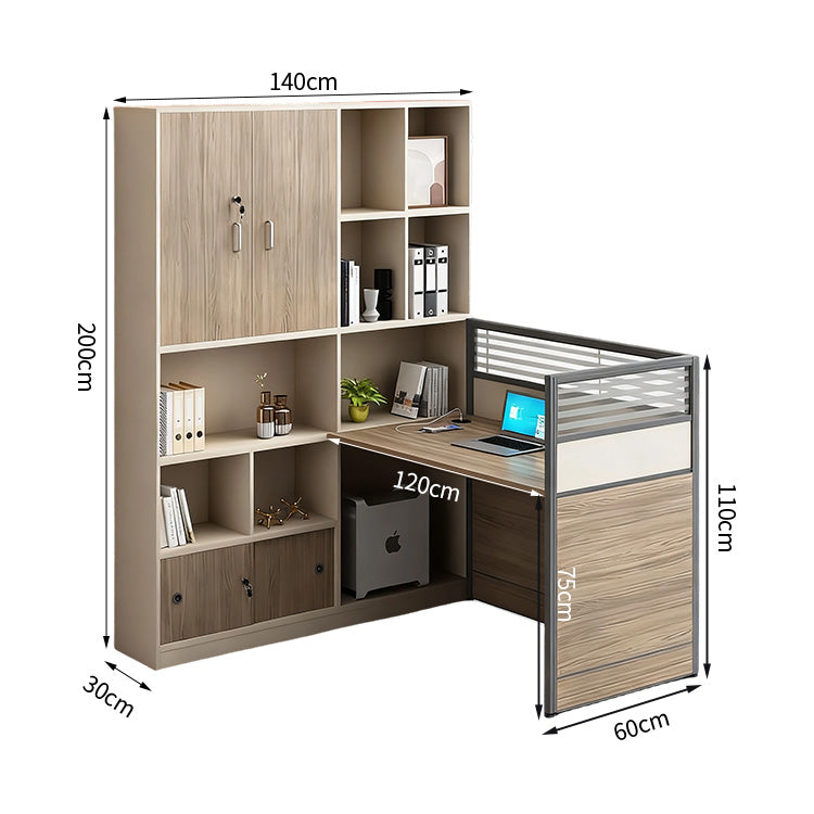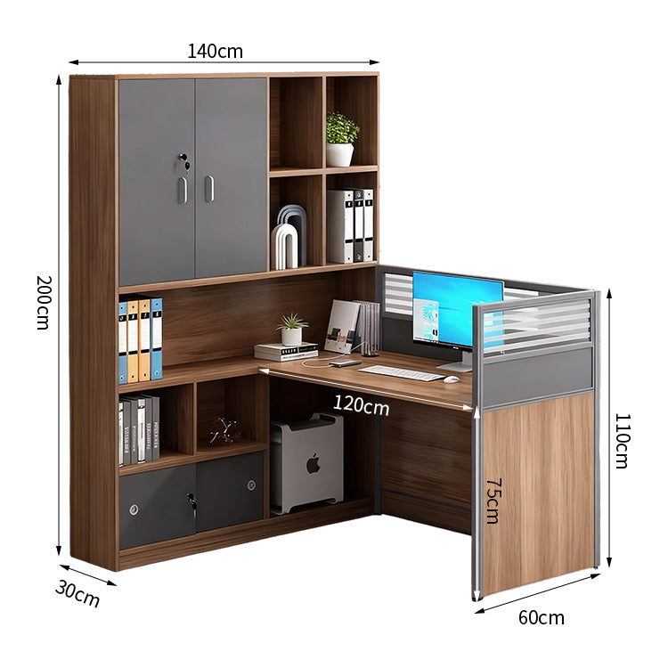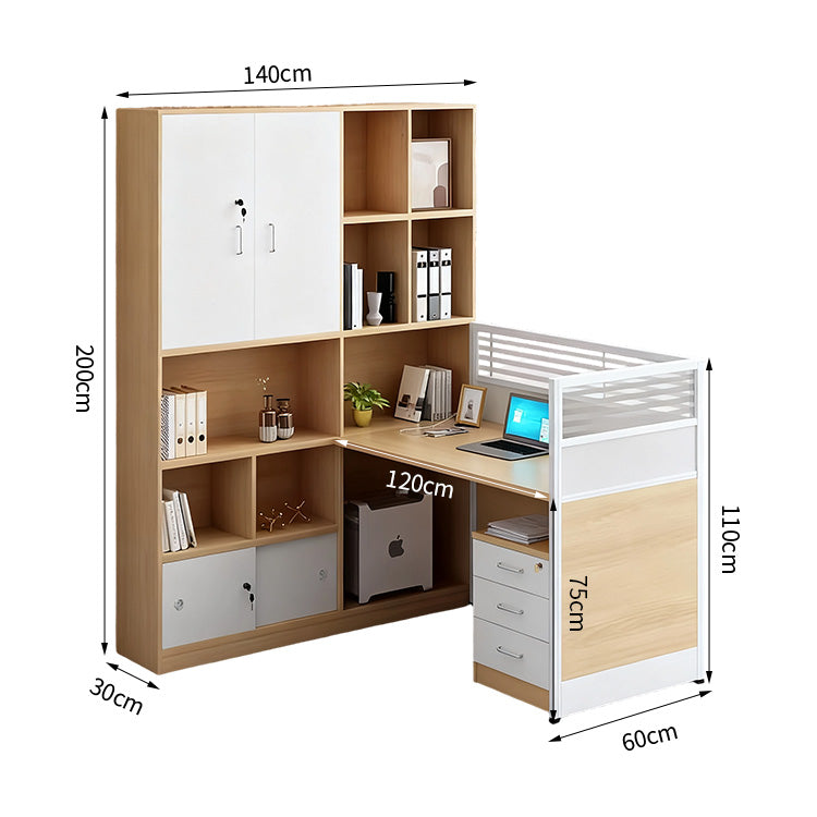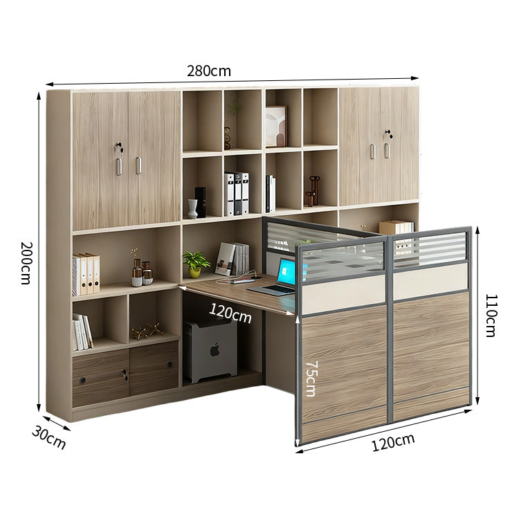 選ばれたデスクは、温かみのある木目調の天板が特徴で、L字型のデザインが空間を効率よく活用すると同時に、スタイリッシュな印象をも漂わせています。サイドキャビネットは必書類やオフィス用品を整理整頓するのに役立ち、幕板がプライバシーを保ちつつ、オフィスをより一層洗練させます。
